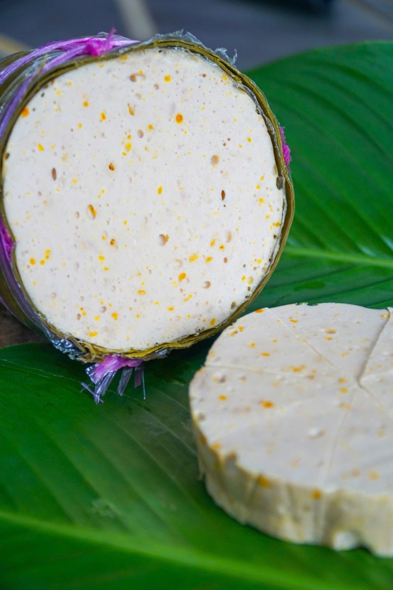 Phần vỏ ngoài của giò được gói bằng 2 lớp lá chuối, đã sấy khô nên rất nhẹ. Chỉ cần bóc tách lớp vỏ là có thể cắt giò và thưởng thức được rồi.