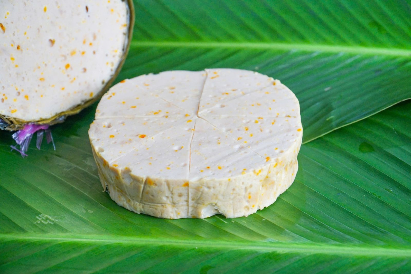 Miếng giò sau khi thái có các sợi Đông trùng hạ thảo được xắt nhỏ màu vàng điểm xuyết bên trong khá thích mắt, mới lạ và hấp dẫn.