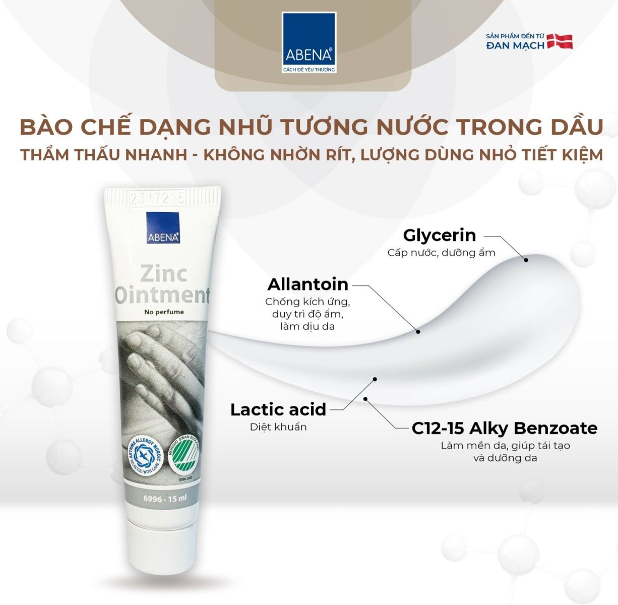 💥💥 Zinc Ointment 15ml Abena chứa 20% kẽm oxide có tác dụng chống hăm vùng bẹn, mông khi thay tã cho bé, đồng thời tạo lớp màng bảo vệ tự nhiên cho da, tránh tái hăm trở lại. Bên cạnh đó, sản phẩm còn chứa Allantoin làm dịu da, làm khô và lành vùng da bị tổn thương do kích ứng, hồng ban do cháy nắng hay các vết trợt da nhẹ.