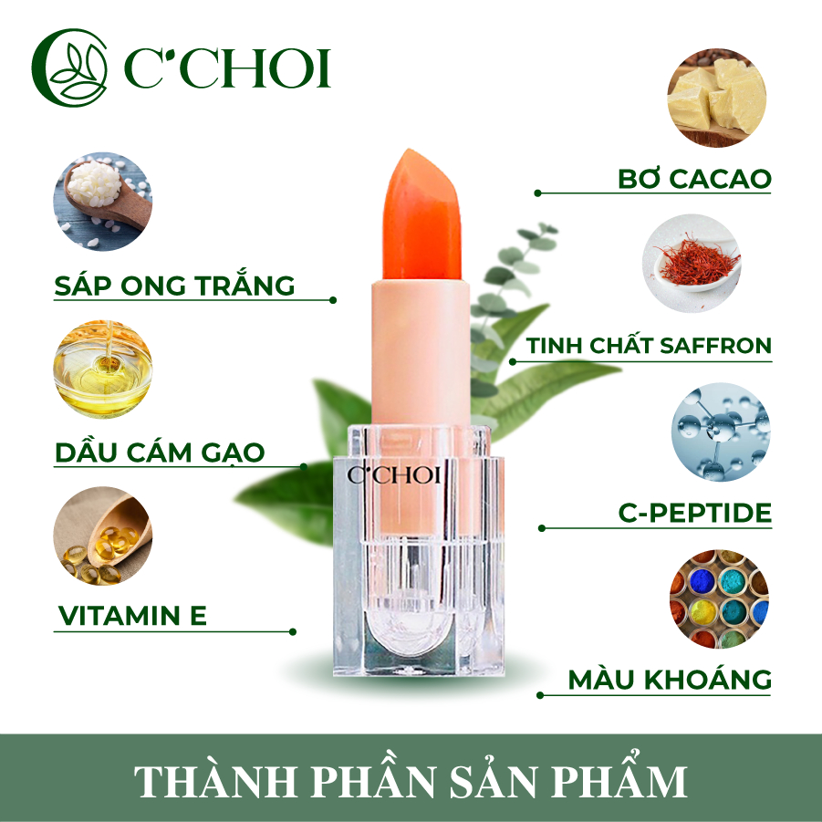 - Công thức dưỡng môi độcg: Kết hợp các thành phần dưỡng chất quý giá như Nhụy hoa nghệ thuật (Saffron), Dầu Cám Gạo, Sáp Ông Trắng, Bơ Ca Cao, C-Pep Elastyl CC, Vitamin E và Màu Khoáng, Son dưỡng môi Saffron Color C'Choi mang đến hiệu quả dưỡng môi vượt trội: